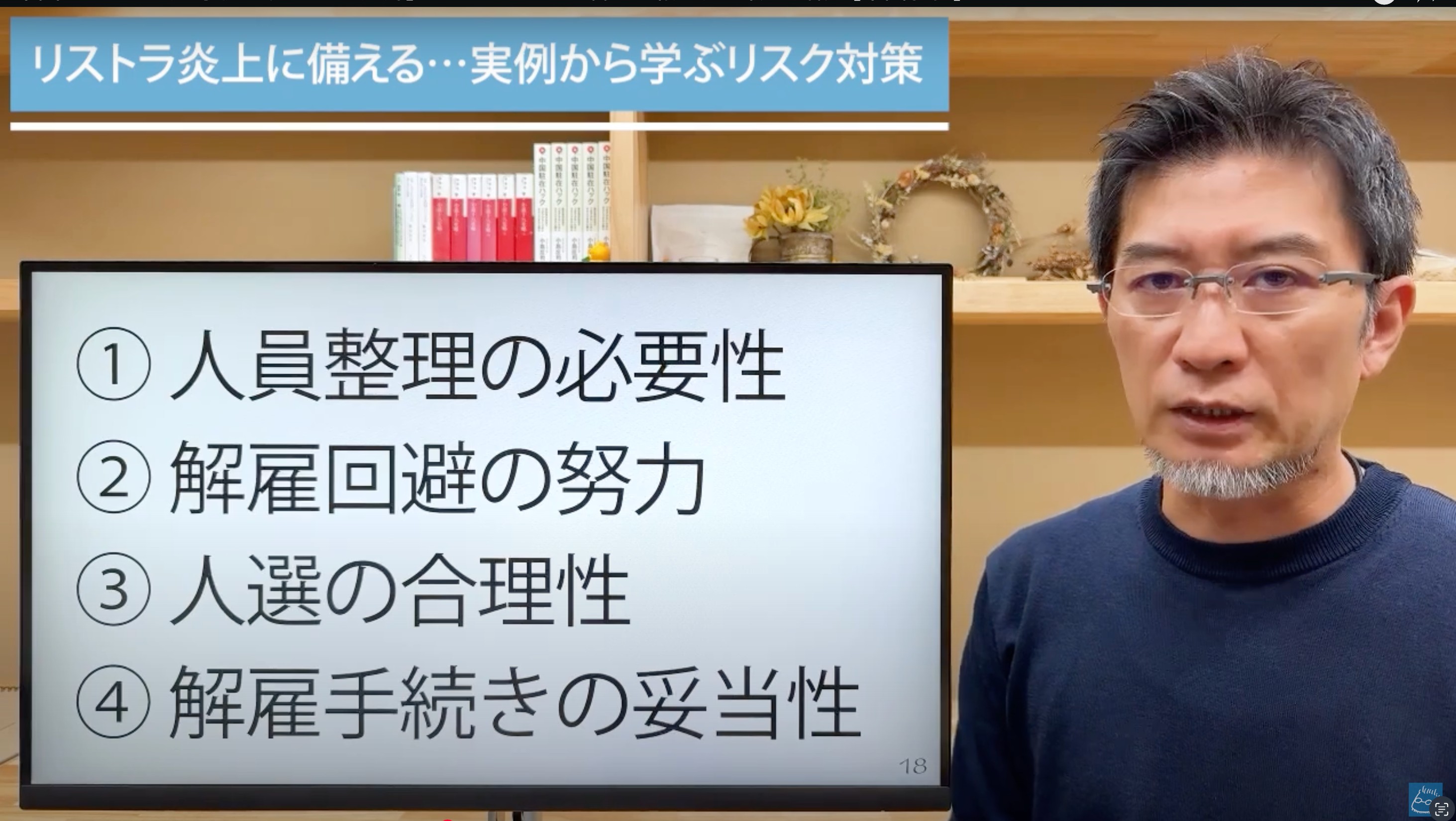 まずは①人員整理の必要性。他の手段ではダメなのか。次に②解雇回避の努力をできる限りしたのか。それから③人選に合理性があるか。最後に④解雇手続きの妥当性が確保されているか。これら四つが問われます。