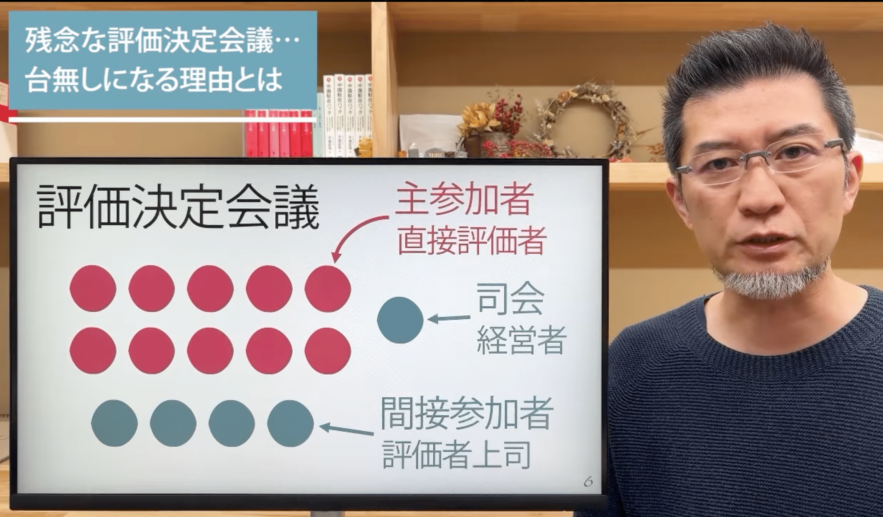 もう一つ重要なメリットは、経営層に評価者の部下観察・部下管理のレベルが手に取るように分かること。評価決定会議を続けると、趣旨に沿って客観的な判断ができ、部下の改善の余地が見えている評価者と、普段から観察も指導もしておらず、結論ありきの主張や印象論しか出せない評価者が可視化されます。